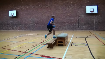 Mettre le premier pas dans un cerceau, le deuxième sur le banc et le troisième sur le plinth. Sauter, tirer et se réceptionner dans la zone des 6 mètres.