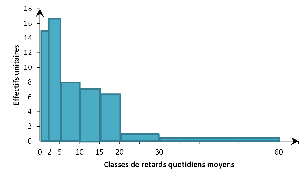 Les classes de retards n'ayant pas toutes la même longueur, il est obligatoire de prendre les hauteurs des rectangles constituant l'histogramme égales aux effectifs unitaires des classes. Pour déterminer ces derniers, il nous faut tout d'abord calculer les fréquences des classes à partir de leurs fréquences cumulées, puis en déduire les effectifs des classes que nous diviserons enfin par les longueurs des classes.